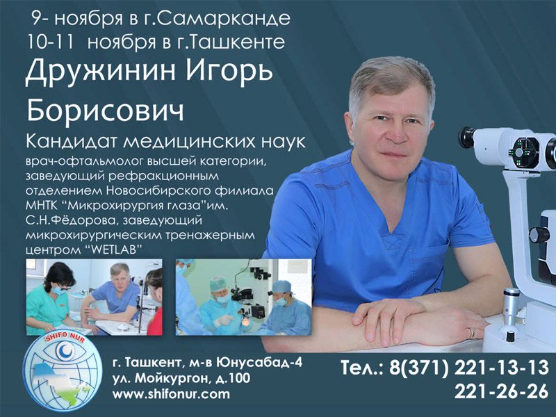 28 iyun kuni Samarqand shahridagi SHIFO NUR ko'p tarmoqli tibbiy markazida, 29 iyun kuni Samarqand shahrida tibbiyot fanlari nomzodi, oliy toifali shifokor — oftalmolog,"Ko'z mikroxirurgiyasi" TITK Novosibirsk filiali mikroxirurgik markazi mudiri Drujinin Igor Borisovich qabul qiladi.