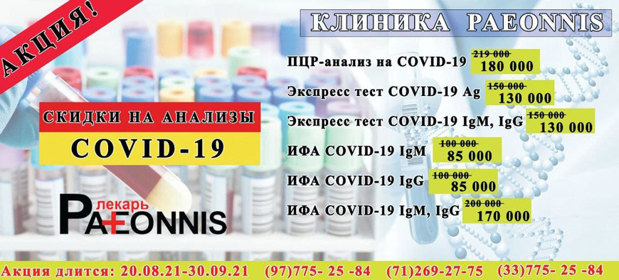 PAEONNIS KLINIKASIDA 2021 YIL 30-SENTABRGACHA COVID-19 TAHLILLARI UCHUN CHEGIRMALAR