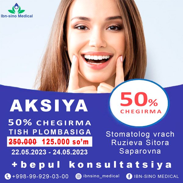 BEPUL KONSULTATSIYA STOMATOLOGDAN VA 50% CHEGIRMA PLOMBAGA IBN SINO MEDICAL KLINIKASIDA