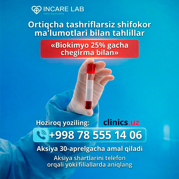 AKSIYA! Qon biokimyosi tahliliga 25% gacha CHEGIRMA INCARE LAB klinikasida!